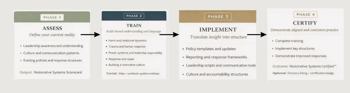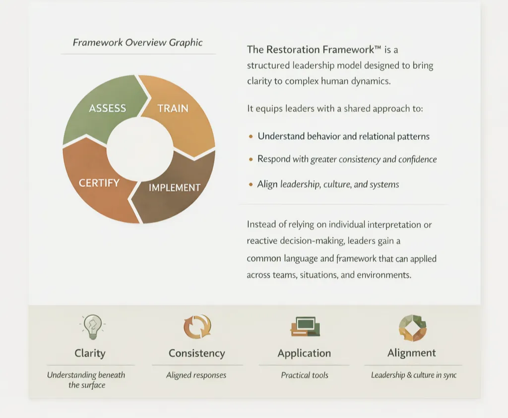 The Restoration Framework™ equips leaders to understand trauma, respond to harm, and build psychologically safe, relationally healthy organizations—personally and systemically.